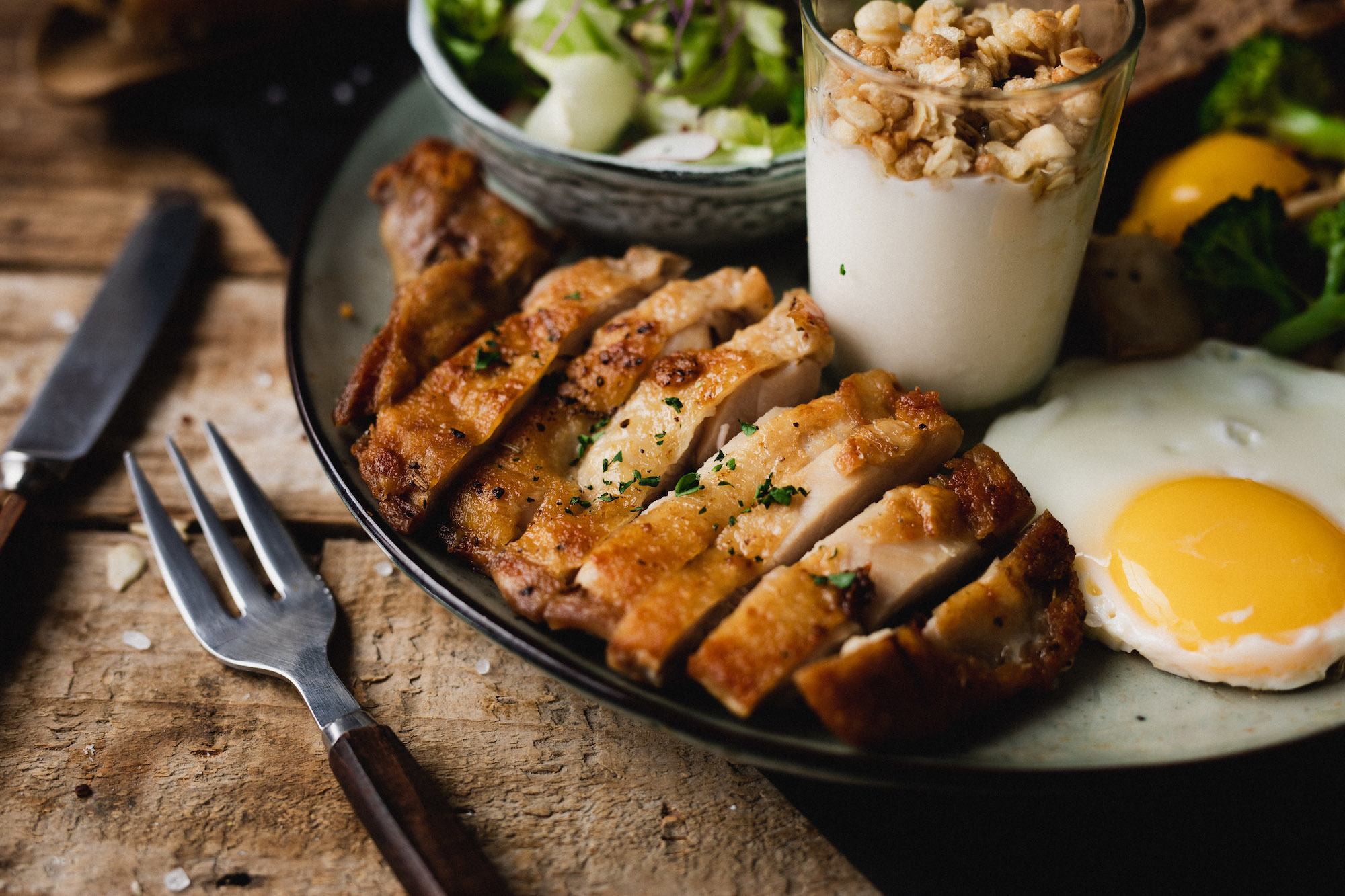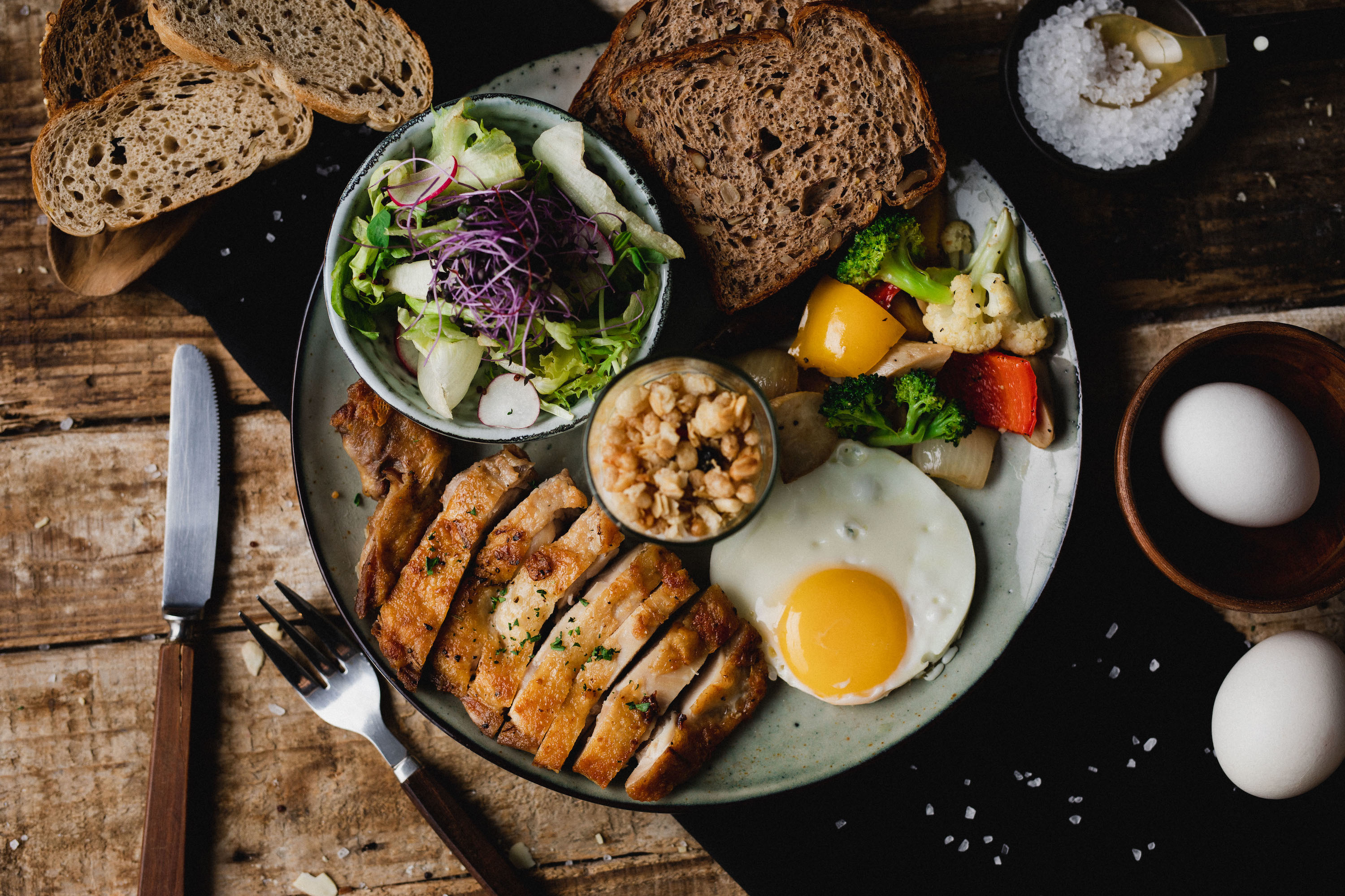 低碳高蛋白餐,滿足食慾及身形的維持;迷迭香雞腿排、優質太陽蛋、果麥優格、小沙拉、溫烤時蔬、蛋白質核桃麵包、香料奶油、覆盆子果醬