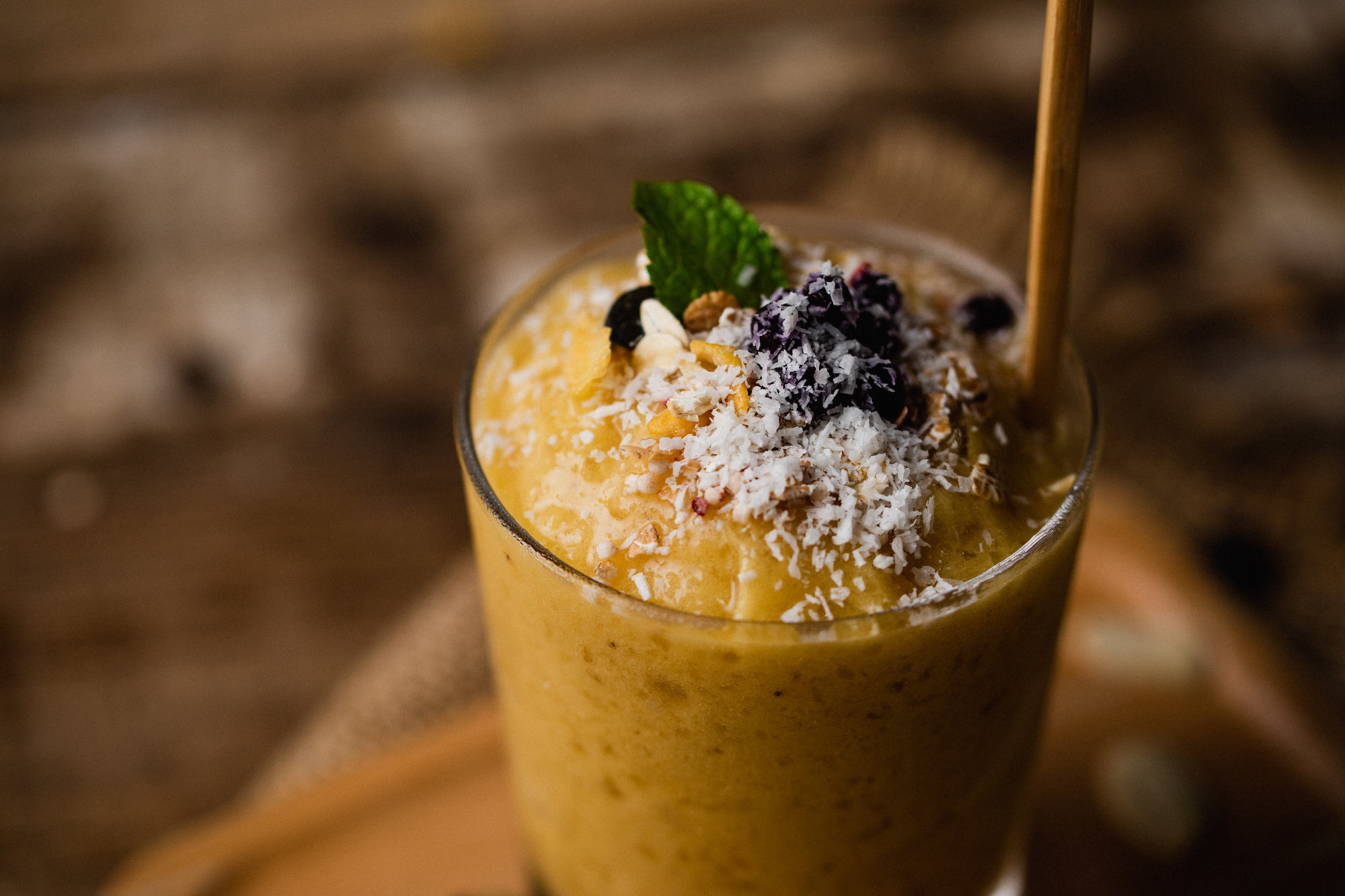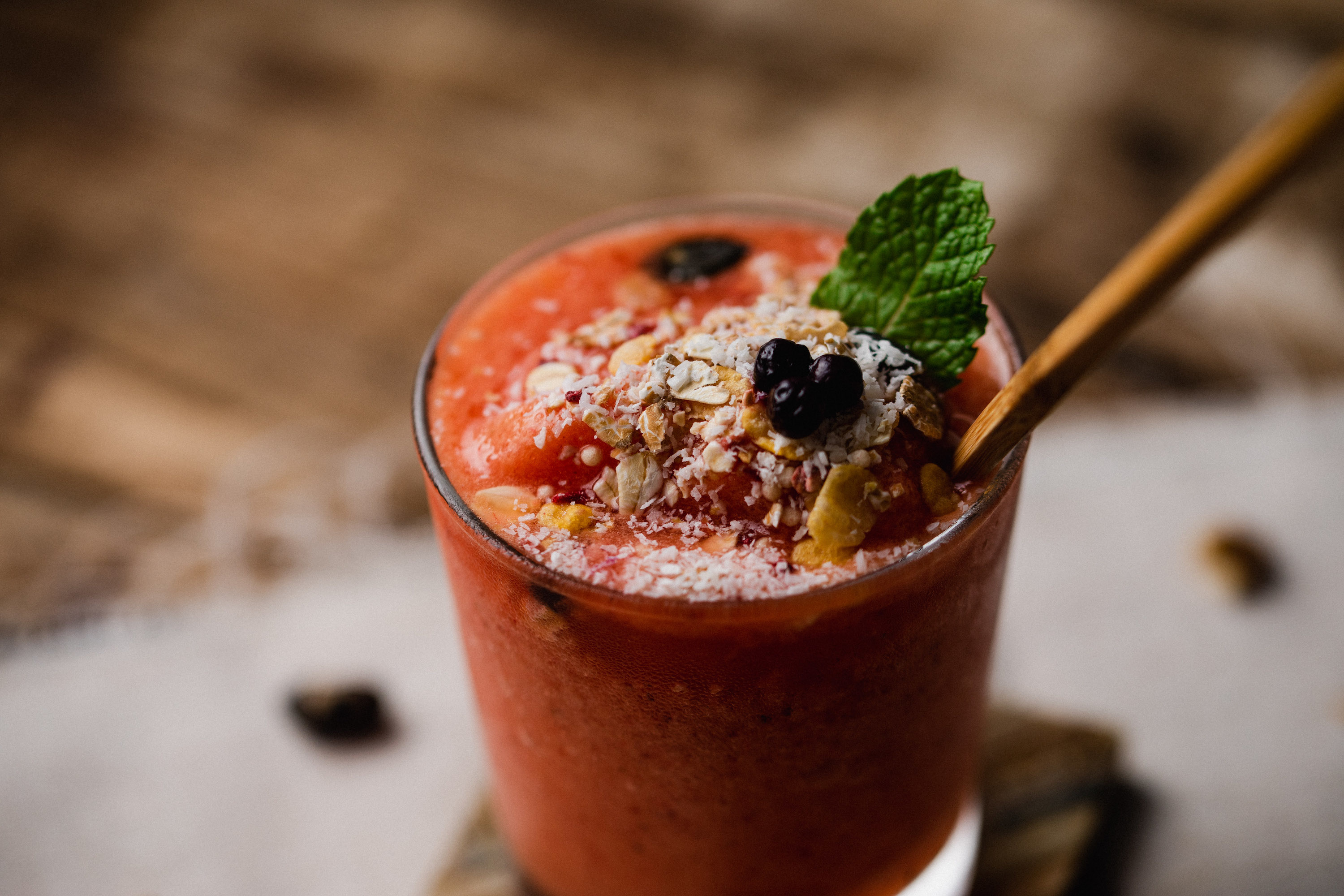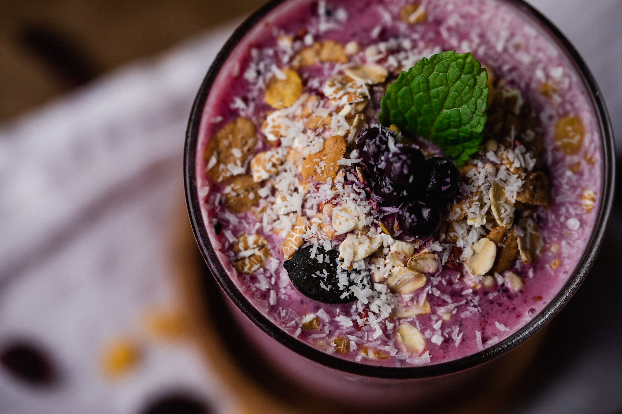 果昔使用新鮮水果搭配,再撒上些許堅果點綴,香甜可口水果及膳食纖維,清爽無負擔。